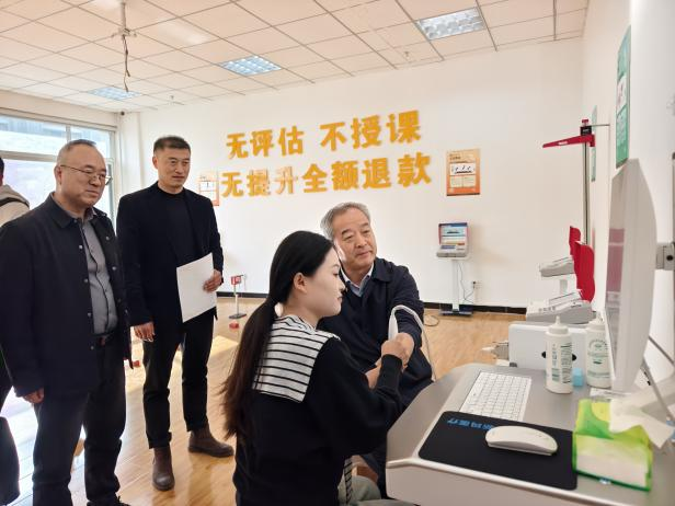 在企业负责人韩建国总经理的陪同下,院领导首先参观了企业的培训基地设施,详细了解师资团队建设情况。魏院长一行亲身体验了国民体质监测设备,通过专业仪器测试了身体骨密度、体成分等多项健康指标;现场实训学生运用所学专业知识,对领导们的测试数据进行了专业解读和健康分析,详细说明了各项指标的健康意义,并提出了针对性的健康建议。该环节充分展示了学生扎实的专业技能和良好的实践能力,也体现了校企合作在实战教学中的显著成效。