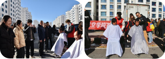 教师党支部魏锋老师、企业导师冯武及学生志愿者充分发挥专业优势,精准对接群众需求,为现场居民开展义剪服务,以实际行动践行共产党员的初心使命。党员教师结合服务过程,向居民面对面解读全会“完善为民服务体系” 的核心要求,将政策宣讲融入民生服务,天马志愿服务队的红色身影成为现场彰显党建引领的鲜明亮点。