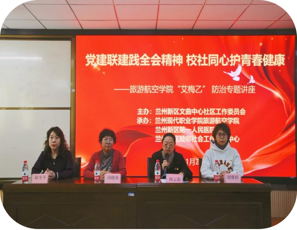 为深入学习贯彻党的二十届四中全会健康中国建设部署,增强大学生健康防护意识,更好地筑牢校园健康防线,围绕2025年“世界艾滋病日”“社会共治,守正创新,终结艾滋”宣传主题,11月28日下午,兰州现代职业学院旅游航空学院党总支联合党建共建单位兰州新区文曲中心社区工作委员会,与兰州新区第一人民医院、新区睦邻社会工作服务中心共同举办了“守护青春健康,共建和谐校园”“艾梅乙”防治专题讲座进校园活动。兰州新区文曲中心社区工作委员会邱冬冬书记、新区睦邻社会工作服务中心工作人员、学生骨干、心理委员及各班学生代表共百余人在阶梯教室参加了活动。活动由旅游航空学院专职副书记陈云蔚主持。