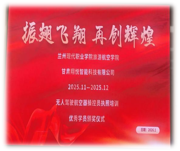 为表彰先进、激励学子深耕专业技能,2026年1月7日,兰州现代职业学院旅游航空学院联合甘肃翔悦智能科技有限公司,隆重举行了无人驾驶航空器操控员执照培训优秀学员表彰大会。旅游学院教学办主任、专业负责人、甘肃翔悦智能科技有限公司项目负责人及相关教师代表出席会议,24级无人机应用技术大专班全体学生参加活动。
