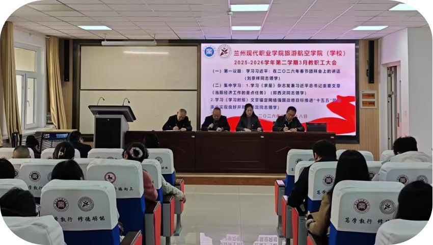 会上,郑西灵院长领学《求是》杂志2026年第4期习近平总书记《当前经济工作的重点任务》一文,要求全体教职工立足旅游航空职教特色,紧扣“提振文旅消费、培育新质生产力”要求,优化人才培养方案,切实提升工作实效。