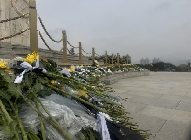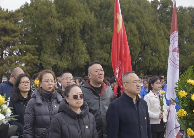 参观结束后,全体人员前往英雄纪念碑前,开展祭奠仪式。纪念碑巍峨矗立,“人民英雄永垂不朽”八个大字熠熠生辉,四周松柏苍翠,庄严肃穆。大家整齐列队、肃立默哀,向革命先烈致以最深切的哀悼和最崇高的敬意。随后,我院领导为烈士敬献花篮、整理花篮缎带,党员教师代表与学生代表共同为烈士献花,表达对英烈的缅怀与敬仰之情,告慰先烈英灵。